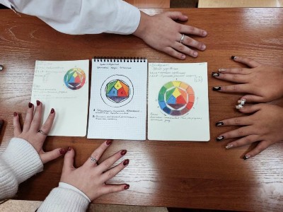На занятии, посвященном науке цвета, преподаватель Оксана Витальевна Чернышева рассказала студийцам школы креативных индустрий о теории цвета, цветовом круге Иттена, основных и дополнительных цветах. Репродукции картин Матисса, Сарьяна, Кузнецова, Кончаловского, Фалька подсказали, как мастера использовали колорит контрастной или нюансной цветовой гаммы. О психологическом воздействии цвета ребята узнали из современных решений графического дизайна, цветового решения видеоконтента.